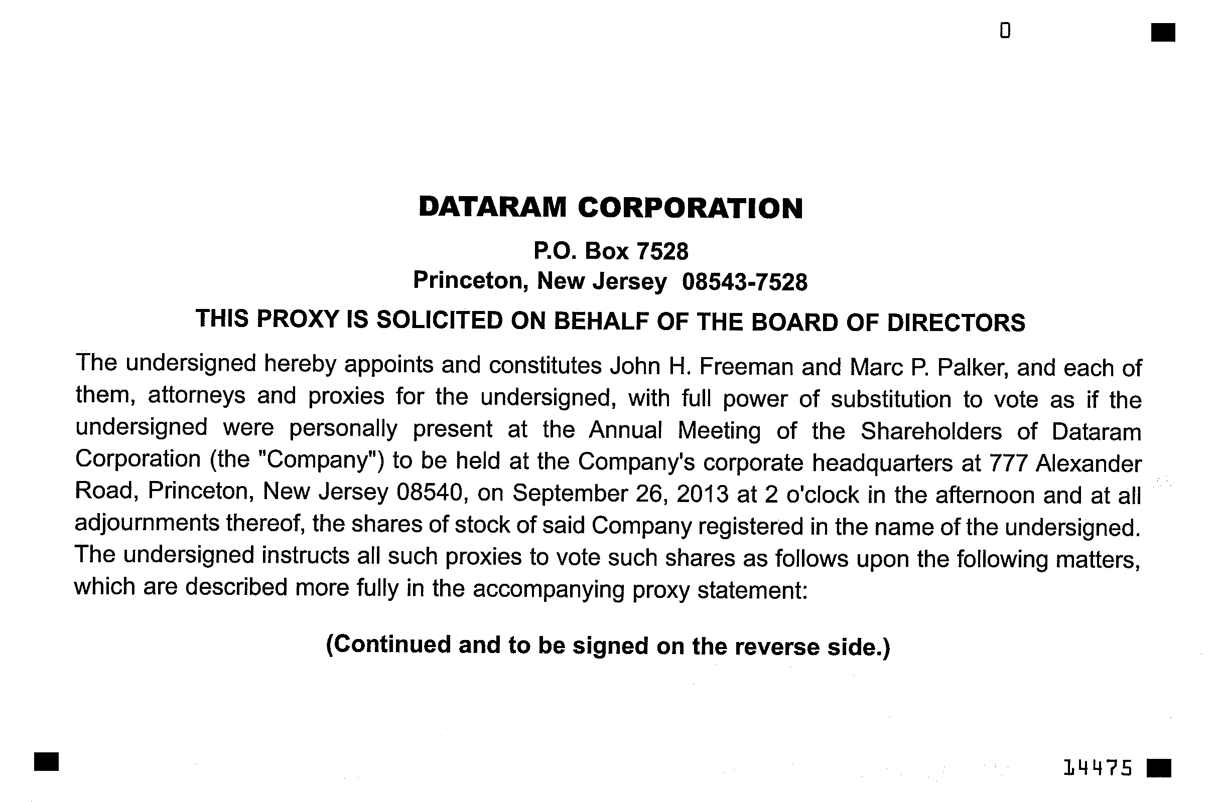 The Annual Meeting of the Shareholders of DATARAM CORPORATION (the “Company”) will be held at the Company’s corporate headquarters at 777 Alexander Road, Suite 100, Princeton, New Jersey 08540, on Thursday, September 26, 2013 at 2:00 p.m., for the following purposes: