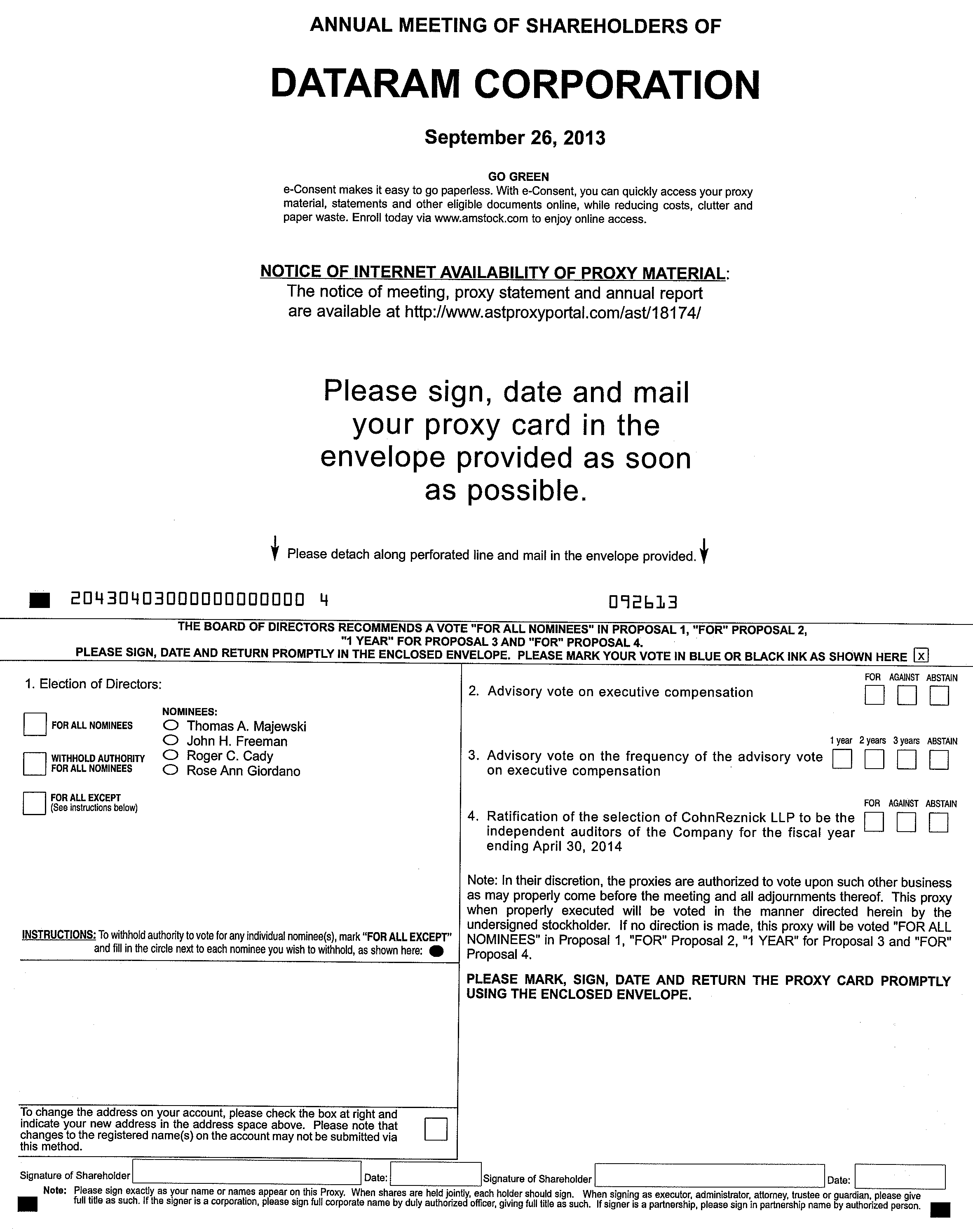 TO THE SHAREHOLDERS OF DATARAM CORPORATION: