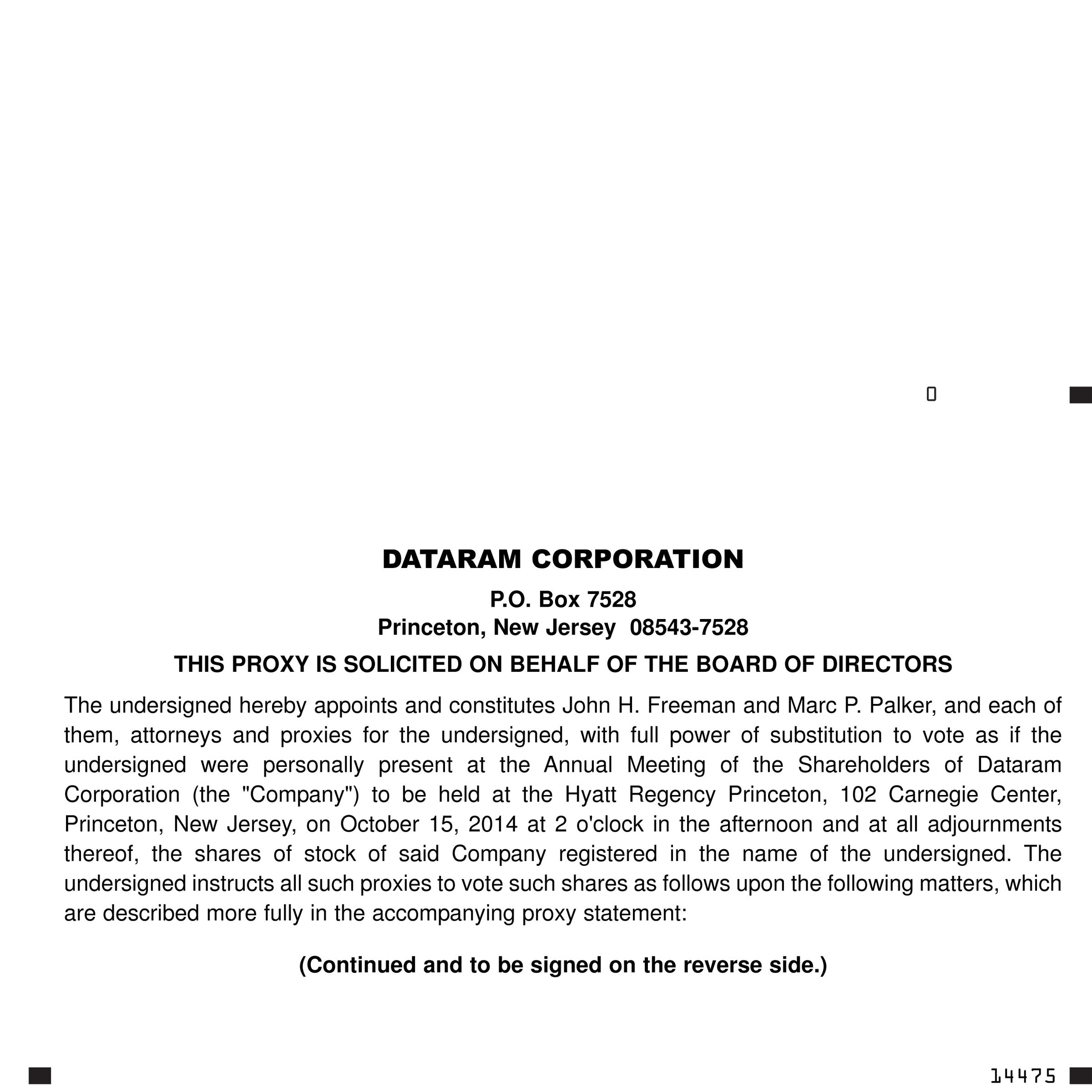 This proxy statement is furnished to shareholders of Dataram Corporation, a New Jersey corporation, in connection with the solicitation of proxies by the Board of Directors (our “Board”) for use at the 2014 Annual Meeting of Shareholders (the “Annual Meeting”) to be held at the Hyatt Regency Princeton, 102 Carnegie Center, Princeton, New Jersey 08540, on Wednesday, October 15, 2014, at 2:00 p.m., Eastern Time, including any adjournments or postponements thereof, for the purposes set forth in the accompanying Notice of Annual Meeting of Shareholders.