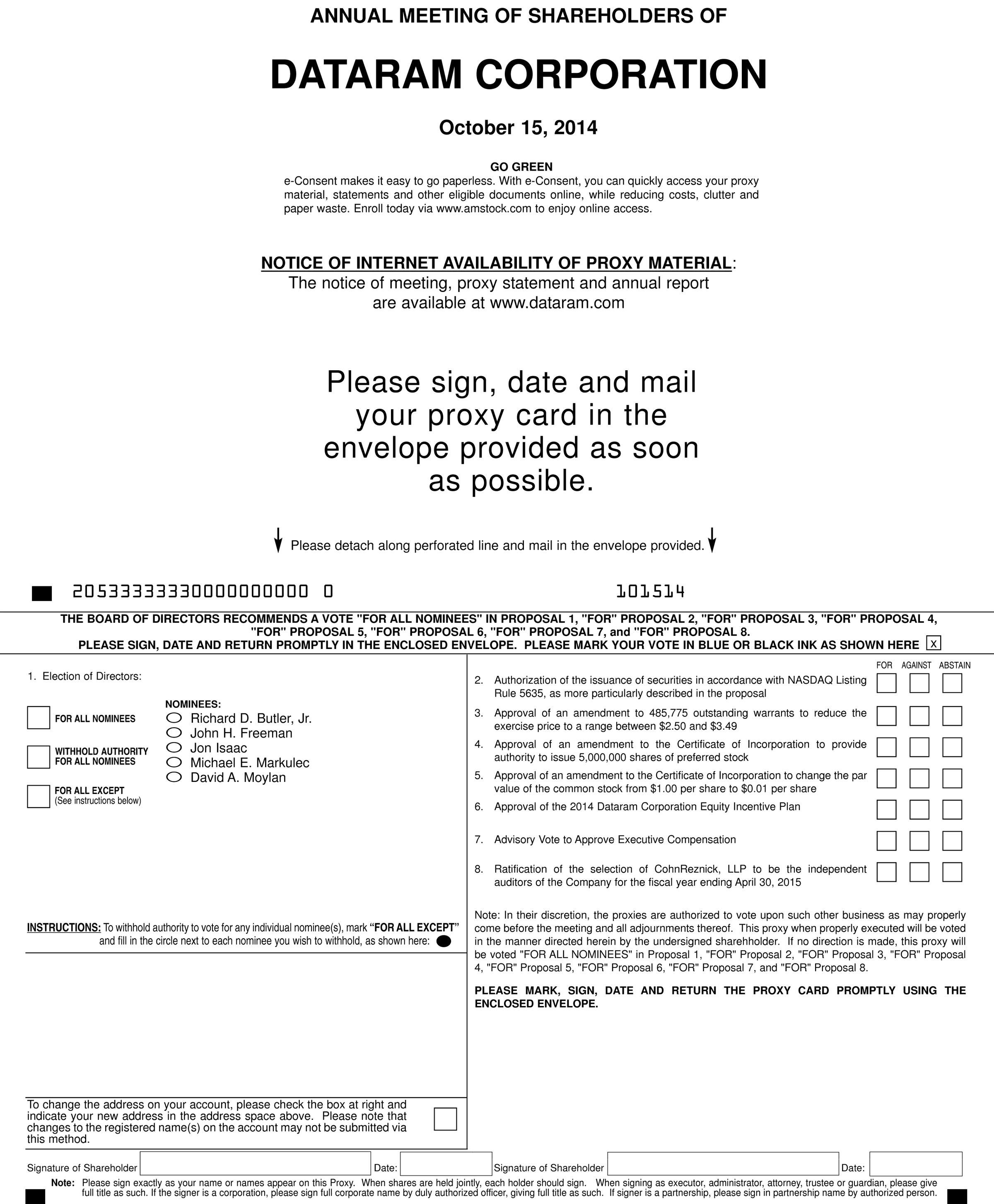 | (6) | To approve the 2014 Dataram Corporation Equity Incentive Plan (the “2014 Plan”), including the reservation of 250,000 shares of common stock for issuance thereunder. | |