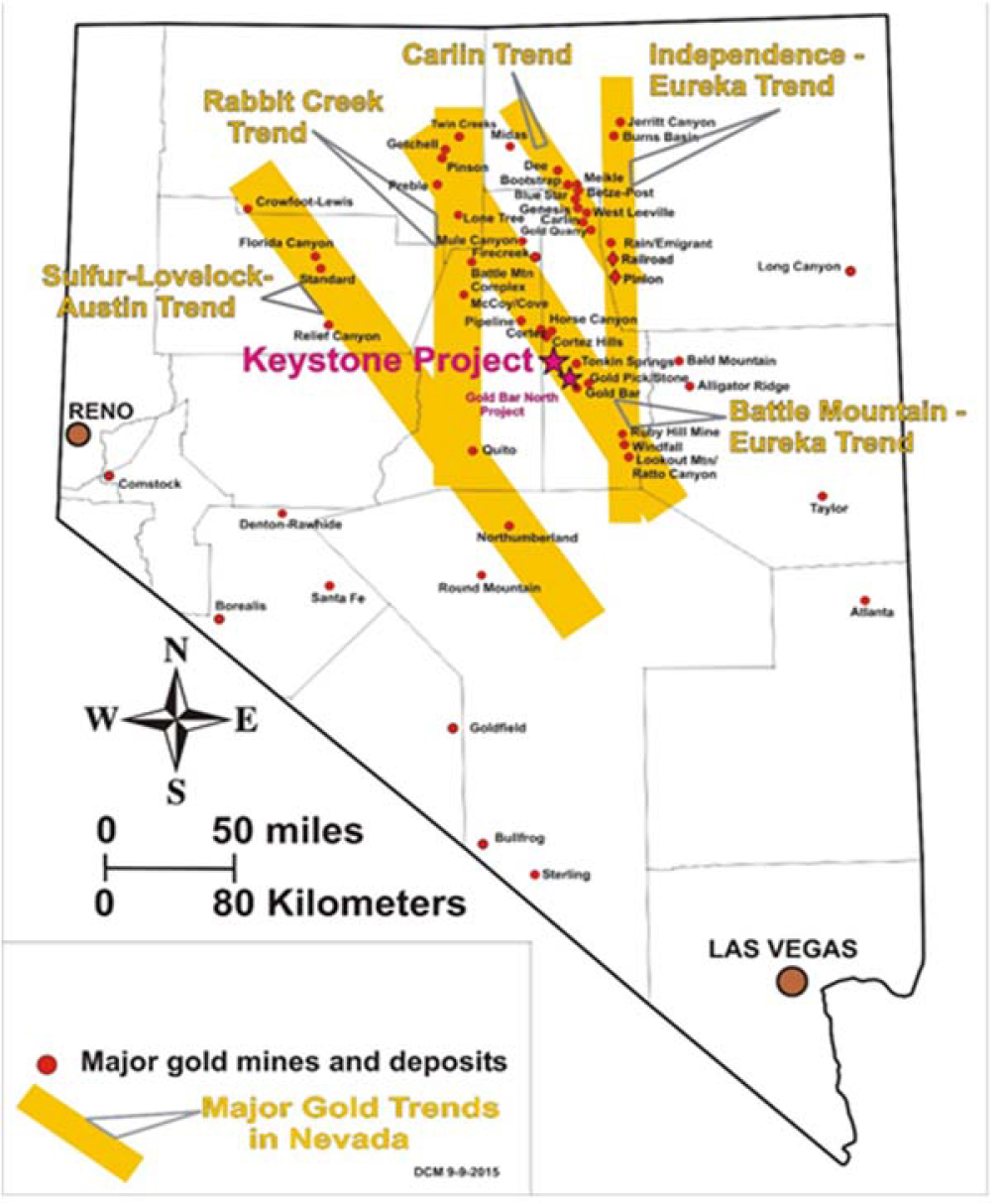 To date, a technical report has not been prepared on the Keystone Project. Keystone is positioned on the prolific Cortez gold trend, one of the world’s leading gold producing regions. The Keystone Project is centered on a granitic intrusion that warped the local Paleozoic stratigraphy into a dome, allowing for exposure of highly favorable Devonian, Carboniferous (Mississippian-Pennsylvania) and Permo-Triassic rocks including key likely host rocks for mineralization, the silty carbonate strata of the Horse Creek Formation and the Wenban limestone, as well as possible sandy clastic units of the Diamond Peak Formation. The Horse Canyon and Wenban rocks are the primary host rocks at the nearby Cortez Hills Mine and Gold Rush deposit currently operated by Barrick Gold.