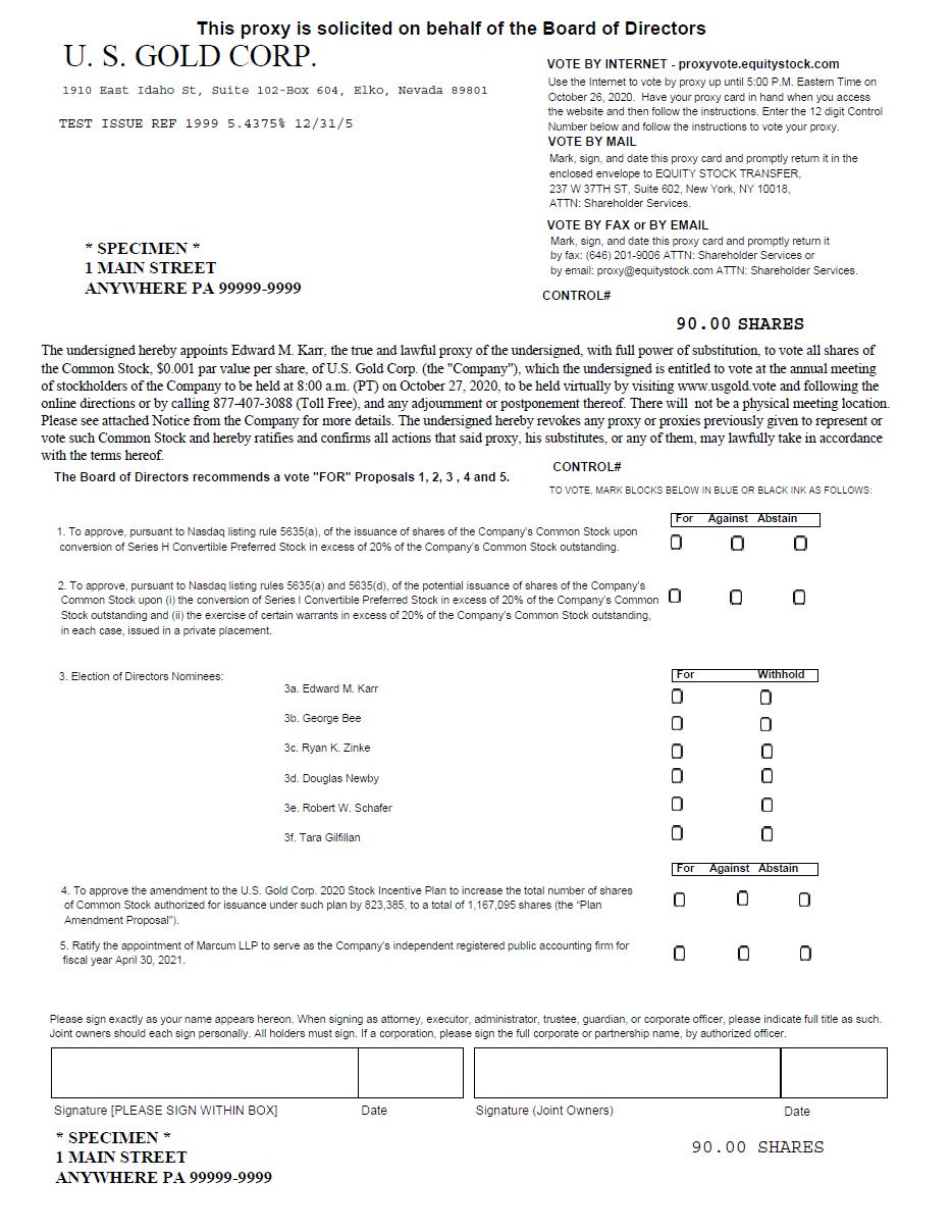 On behalf of the Board of Directors and management, I invite you to attend the 2020 Annual Meeting of Stockholders (the “Annual Meeting”) of U.S. Gold Corp. to be conducted in a virtual format only via live webcast at 8:00 a.m. PT on October 27, 2020, at www.usgold.vote. The attached notice of Annual Meeting and proxy statement describe the matters to be presented at the Annual Meeting and provide information about us that you should consider when you vote your shares.
