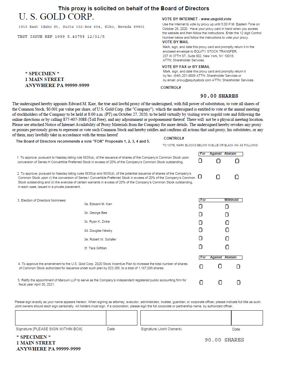 On behalf of the Board of Directors and management, I invite you to attend the 2020 Annual Meeting of Stockholders (the “Annual Meeting”) of U.S. Gold Corp. to be conducted in a virtual format only via live webcast at 8:00 a.m. Pacific Time on October 27, 2020, at www.usgold.vote. The attached notice of Annual Meeting and proxy statement describe the matters to be presented at the Annual Meeting and provide information about us that you should consider when you vote your shares.