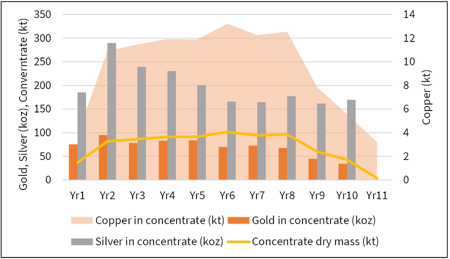 The FS confirms robust economics for a low-cost, large-scale, conventional open pit feeding a simple copper-gold concentrator process plant, with competitive operating costs and high rate of return. The FS outlines total production of: 931 koz AuEq over an 11-year operating mine life (followed by two years of closure), resulting in an average LOM annual production profile of 85 koz AuEq per annum at an AISC of $1785/oz AuEq. The Project generates an after-tax NPV5% of $632 M with an after-tax IRR of 27% at base case gold, copper and silver prices of $3,250/oz, $4.50/lb and $40/oz, respectively.